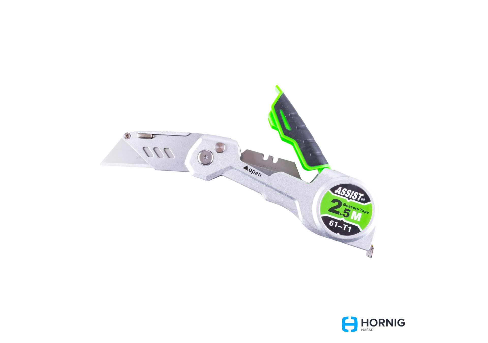 ASSIST nůž kovový sklopný 2v1 s lichoběžníkovým břitem a 2,5m svinovacím metrem, bezpečnostní pojistka a kovová spona.
