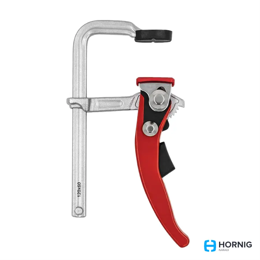 Ráčnová rukojeť má vynikající účinnost upnutí a extrémně rychlé sevření. Díky jednoduchému ráčnovému mechanismu lze svěrku rychle upnout či uvolnit pouze jednou rukou, aniž by byl upínaný předmět poškozen. Po upnutí je svěrka pevná a stabilní, neuvolňují ji vibrace z elektrického nářadí. Díky celokovové konstrukci je páková svěrka také vysoce odolná vůči opotřebení a její životnost je extrémně dlouhá. Spodní i horní část čelistí je vybavena plastovou krytkou, která zabezpečuje pevné uchycení bez poškození dílce.