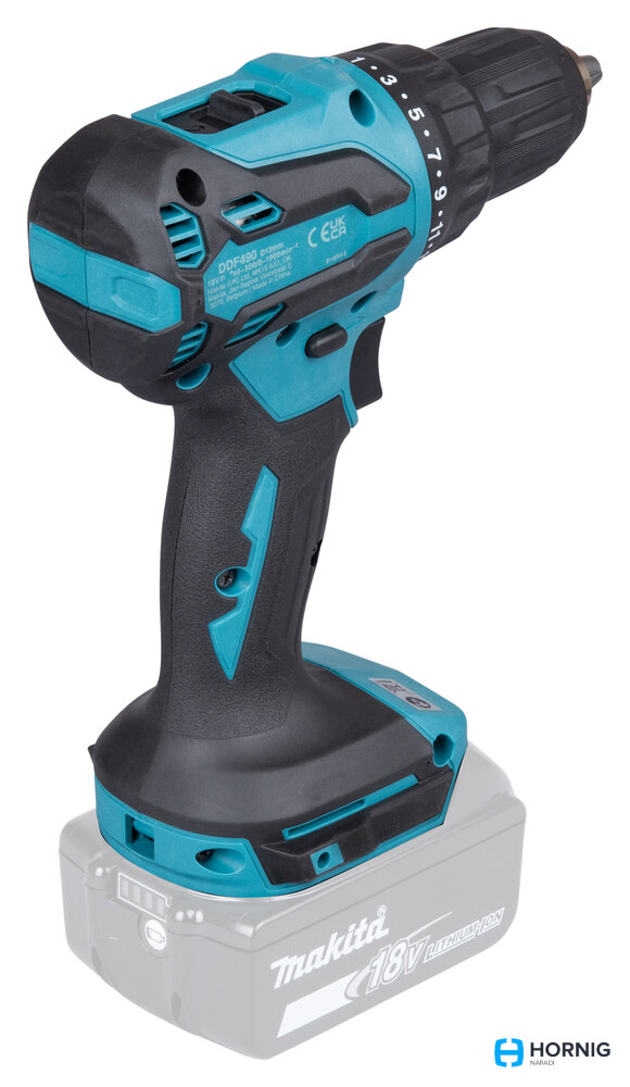 Lehká a výkonná akumulátorová vrtačka MAKITA DDF490WVE s bezuhlíkovým motorem, 2 akumulátory a kufrem.